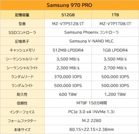 970 PROの容量ラインナップは512GBと1TBの2モデルのみで、960 PROに存在した2TBモデルは廃止された。2018年時点で、同じ数のメモリセルでMLCの1.5倍の容量を実現できるTLCが大容量SSDの主役であり、Samsung製SSDに関しても大容量製品はV-NAND TLCを採用する「970 EVO」が担当し、970 PROは性能特化という位置づけとなっていた。