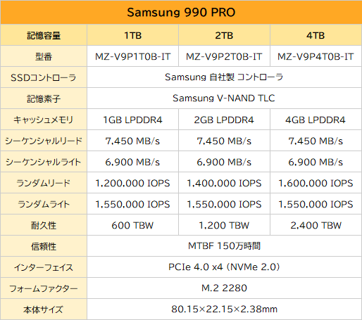 2022年、7,450MB/sの最大速度を実現、第7世代V-NAND TLC採用の「990 PRO」