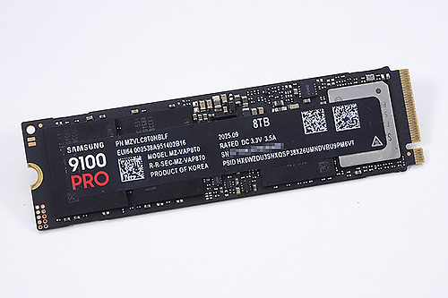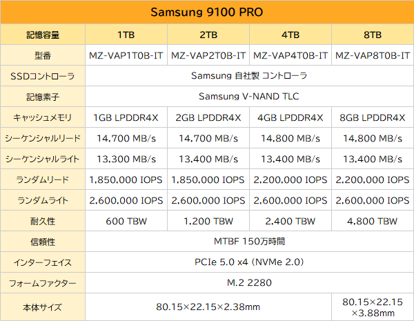 9100 PROの最大速度はリード14,800MB/s、ライト13,400MB/sで、PCIe 5.0 x4に対応するSSDの中でも最速級の性能を実現している。発売時点での容量ラインナップは1TB、2TB、4TBの3モデルで、2025年10月にV-NAND TLCを基板両面に実装した8TBモデルが追加された。