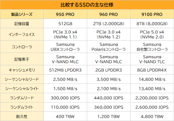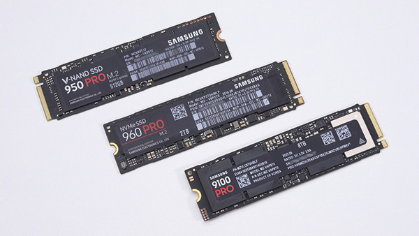今回パフォーマンスを比較するのは、Samsungの初代M.2型NVMe SSDである950 PRO(512GB)と、2世代目の960 PRO(2TB)、そして最新鋭製品である9100 PRO(8TB)の3製品。いずれも各シリーズの最大容量モデルをテストする。