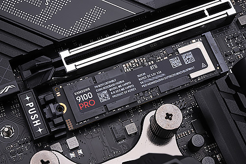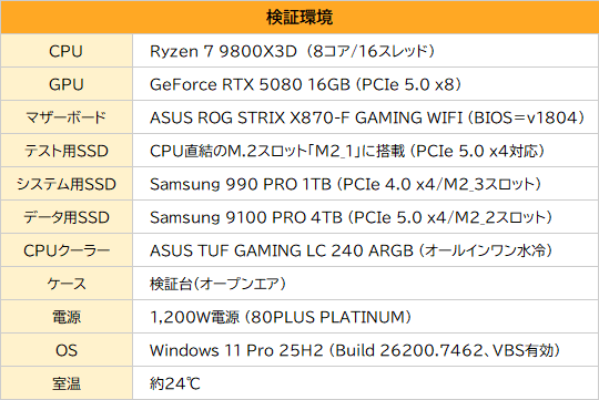 各SSDをテストするのは、Ryzen 7 9800X3Dを搭載したAMD X870環境。使用したマザーボードはASUS ROG STRIX X870-F GAMING WIFIで、テスト対象のSSDをPCIe 5.0 x4対応のM2_1スロットに搭載。ファイル転送テスト用として2本目のPCIe 5.0 x4対応M.2スロット(M2_2)には9100 PROの4TBモデルを搭載した。