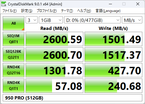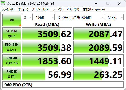いずれもほぼスペック通りのパフォーマンスを発揮しており、9100 PROが記録した速度は950 PRO比でリード約5.7倍、ライト約8.9倍。960 PRO比でもリード約4.2倍、ライト約6.4倍であり、PCIe 5.0 SSDが旧世代のPCIe 3.0 SSDを圧倒している。