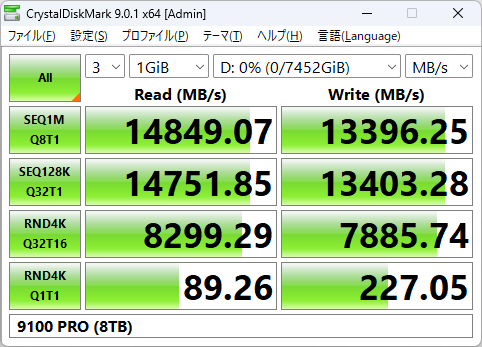 各SSDが記録したシーケンシャルアクセス時(Q8T1)の最大速度は、950 PROがリード2,600MB/s、ライト1,501MB/s。960 PROはリード3,509MB/s、ライト2,087MB/s。9100 PROがリード14,849MB/s、ライト13,396MB/sだった。
