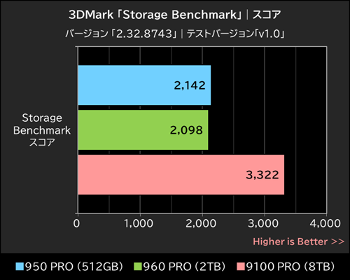 各SSDが記録したベンチマークスコアは、950 PROが2,142、960 PROは2,098、9100 PROは3,322で、9100 PROは旧世代SSDを1.6倍弱も上回ってみせた。