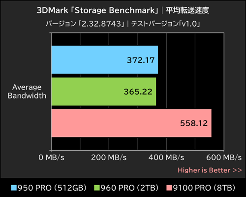 ゲームに関連したストレージデバイスのデータアクセス性能を計測する3DMark「Storage Benchmark」を実行。各SSDのベンチマークスコアを計測したほか、サブスコアである平均転送速度と平均アクセスタイムも取得した。