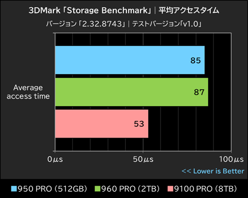 9100 PROはサブスコアの平均転送速度でも旧世代SSDの約1.5倍の速度を記録し、平均アクセスタイムは40%も削減しており、ランダムアクセス性能が問われるゲームなどでの実行性能に関しても大きく向上している様子が見て取れる。