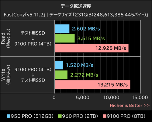950 PROが231GiBのファイル転送を行った場合、読み出しで95秒、書き込みで163秒を要した。読み書き速度が向上した960 PROでも、読み出しで70秒、書き込みでは109秒かかっているのだが、9100 PROは読み出しで19.2秒、書き込みでは18.8秒でファイル転送を完了した。