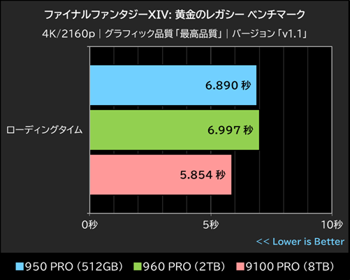 ゲームにおけるシーンチェンジ時のローディングタイムを計測できる「ファイナルファンタジーXIV: 黄金のレガシー ベンチマーク」では、グラフィックプリセットを最高品質、画面解像度を4K/2160p(3,840×2,160ドット)に設定してベンチマークテストを実行。各SSDのローディングタイムを比較した。