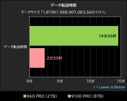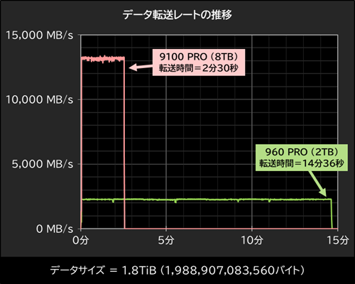 960 PRO 2TBと9100 PRO 8TBに1.8TiBのデータ転送を行い、パフォーマンスを比較した結果が以下のグラフだ。