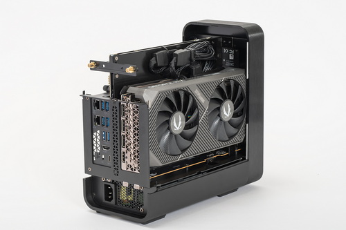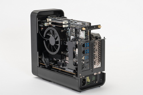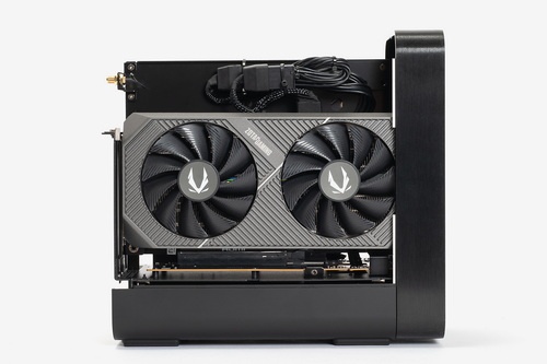 背面を見ると、自作PCユーザーならおなじみの拡張カードが搭載されていることが分かる。つまり本機では、GeForce RTX 5070 Tiのビデオカードそのものを搭載している。もちろんサイズや構造、消費電力やファン制御などの問題もあり、ビデオカードを換装したり、メーカーがGPU換装を公式にサポートしていたりするわけではない。しかし、“ミニPCでビデオカードを搭載する構造”自体がそもそも珍しく、将来的なアップデートの余地を連想させる。そうした“先々の期待感”も、このモデルの魅力と言えそうだ。