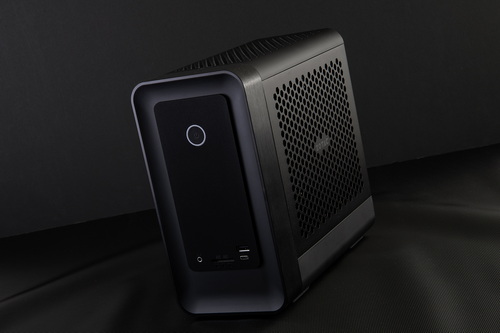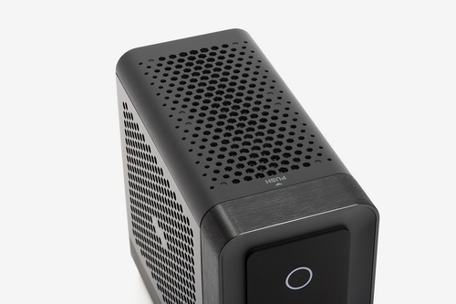 筐体は、デスクトップPCとして考えるとかなり小さく、置き場所を選ばない。高性能なパーツを組み込む小型PCでは発熱も気になるところだが、金属製のフレームにはハニカム形状の通気口が多数設けられており、通気性に優れる。天板に搭載する2基の排気用ケースファンにより両側板から外気をたっぷりと取り込んで、CPUやビデオカードを冷却できるエアフローを構築している。