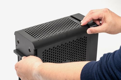 MAGNUS ONE EU27507TCでは、非常に簡単な作業で内部にアクセスできる。まずは背面から天板を固定する2本の手回しネジを外し、天板の固定を解除しよう。この状態で天板を背面方向に引き抜き、さらに両側板を上に引き抜くだけでよい。