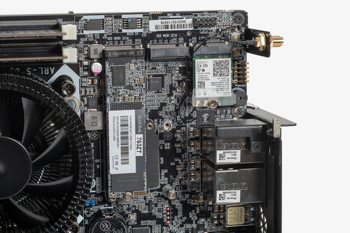 SO-DIMMメモリとM.2 SSDは、左側面のマザーボード表面に装着する。M.2 SSDスロットは2基装備しており、システム用のM.2 SSD、データ用のM.2 SSDといった使い分けも可能だ。また同じく左側面には2.5インチSSDを挿すだけでよい2.5インチシャドーベイもあり、SSDの自由度が高い。