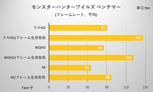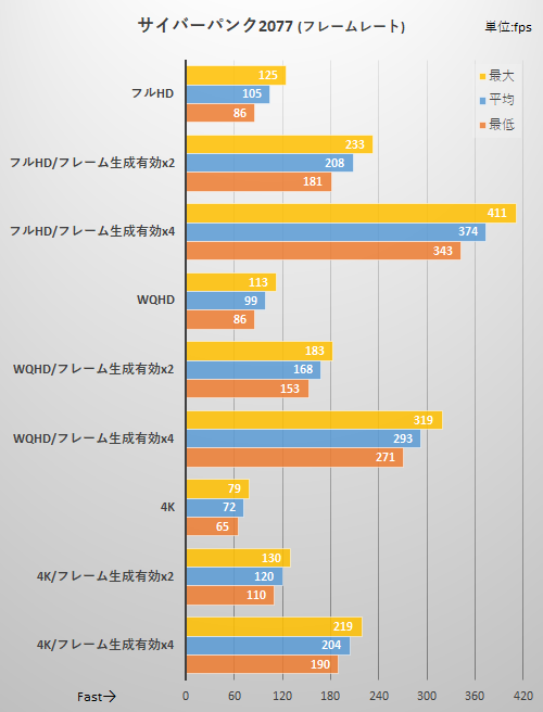 解像度をフルHD(1,920×1,080ドット)、WQHD(2,560×1,440ドット)、4K(3,840×2,160ドット)の3通りに設定し、それぞれフレーム生成機能の有効/無効でフレームレートなどを比較したのが下のグラフだ。