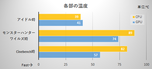 CPUに連続的な負荷をかけるCinebench時のCPU温度は82℃、CPUとGPUの両方に高い負荷がかかるMH時は89℃だった。小型PCなのでちょっと高めではあるが、問題が発生する温度ではない。一方でGPU温度は、長時間のPCゲームプレイを想定したMH時でも75℃と、かなり低い。前述したようにしっかりと外気を取り込み、ビデオカードを冷却できているからだろう。コンパクトな筐体ながら、冷却性能は十分高い。