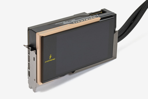 RTX 5090 LIGHTNING Zのカード本体には8インチの液晶が内蔵されている。GPU温度などを表示するための小さな液晶を搭載したビデオカードはこれまでにも存在するが、RTX 5090 LIGHTNING Zの液晶はカスタマイズ性が高いという点で一線を画している。