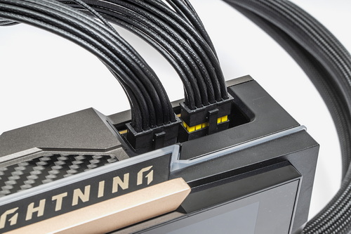 RTX 5090 LIGHTNING ZのTGPは800Wがデフォルトであるため、補助電源は12V-2x6ケーブル2本を必要とする。電源ユニットもそれなりのものを確保する必要があるが、95万円のビデオカードを使おうという人ならそれなりの電源ユニットをすでに確保しているはずだ。一応LIGHTNING Zには8ピン4系統を12V-2x6に変換するケーブルが「1本だけ」同梱されているが、これは12V-2x6ケーブルが1系統しかない電源ユニットでどうにか起動確認をするだけの「保険」と考えたい。