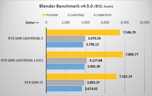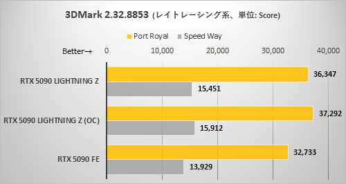 このテストでは3DMarkよりもさらに伸びが鈍い。RTX 5090 LIGHTNING Zのデフォルト設定時ではRTX 5090 FEに対し2〜5%、EXTREMEモード+OC設定で6〜9%の伸びに終わっている。