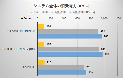 ただ、事前検証によってRTX 5090 LIGHTNING Zは高負荷時にPCI Express x16スロットから16W程度、RTX 5090 FEは8W程度の電力を消費することが判明した。この程度の値なら消費電力への影響はないと判断している。