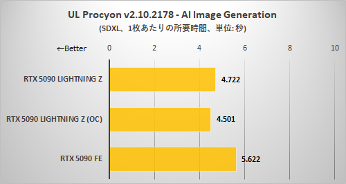 イメージ1枚あたりの生成時間であるため、グラフのバーが短いほど高速。今回の検証ではRTX 5090 LIGHTNING ZはRTX 5090 FEに1秒前後短縮することに成功している。RTX 5090 LIGHTNING Zのデフォルト設定とEXTREMEモード+OC設定を比較すると大した短縮にはなっていないが、一応効果があることは示された。