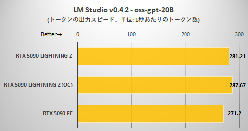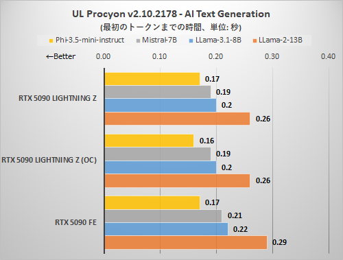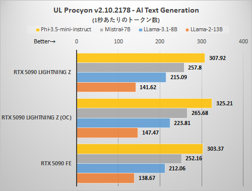 UL ProcyonのAI Text Generation Benchmarkと大きく傾向が変わるものではなかった。RTX 5090 LIGHTNING Zのデフォルト設定ではRTX 5090 FEに対しトークンの出力スピードで3%優位に、EXTREMEモード+OC設定では6%優位にとどまる。