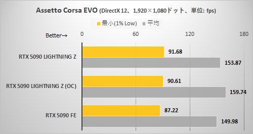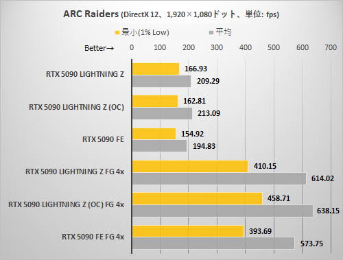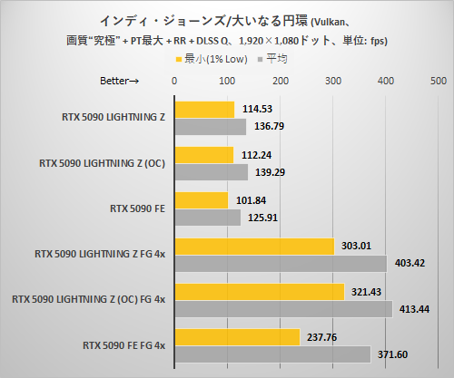 フレームレートの出方はRTX 5090 LIGHTNING ZのEXTREMEモード+OC設定が最も高く、続いてRTX 5090 LIGHTNING Zのデフォルト設定、最後がRTX 5090 FEという順番になった。クロック設定を考えればごく当然の結果と言える。フレーム生成を使わない状態でもRTX 5090 FEに対し大きな差を付けている点に注目したい。