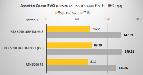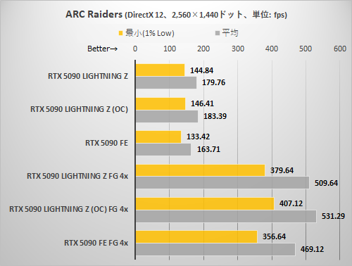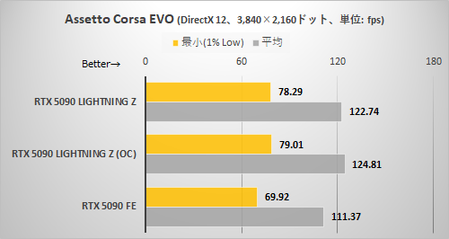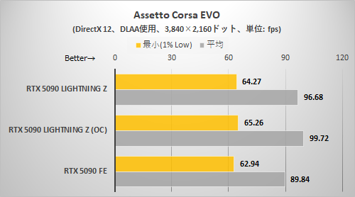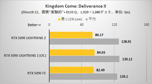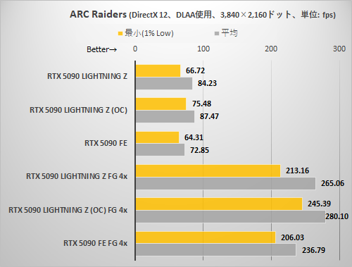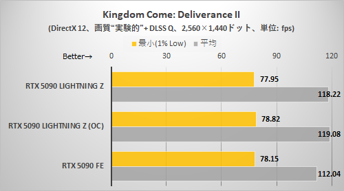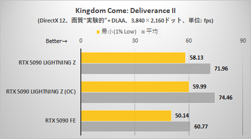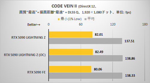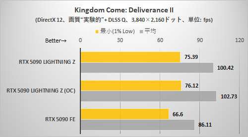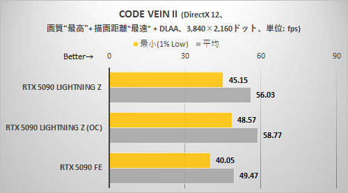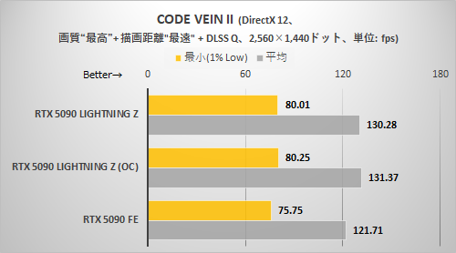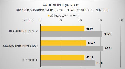 CODE VEIN IIと同様に解像度が高くないとRTX 5090 LIGHTNING Zの持ち味がまったく出てこない。3,840×2,160ドット+DLSSクオリティ設定でようやくRTX 5090 LIGHTNING ZはRTX 5090 FEより確実に速いと断言できる程度に差が拡がった。