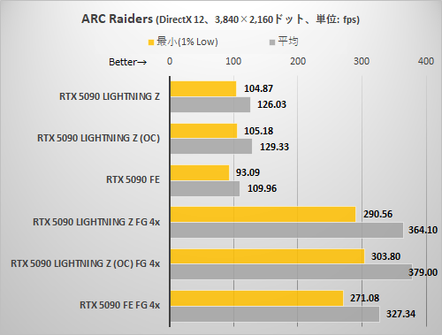 解像度が上がるに従いRTX 5090 LIGHTNING ZとRTX 5090 FEの差が徐々に開いてくる。最低フレームレート(正確には下位1パーセンタイル点以下の平均)はあまり変わっていないため、フレームレートの上振れはGPU由来、下振れはCPU由来と考えることができる。