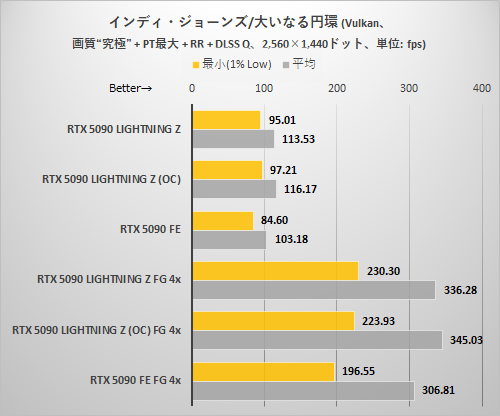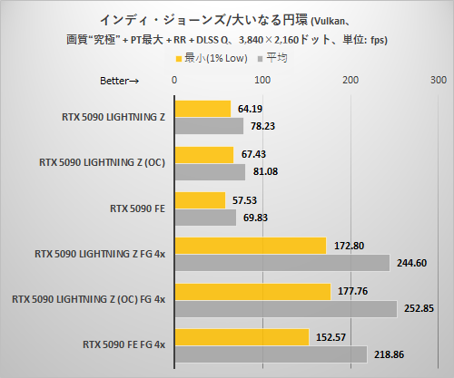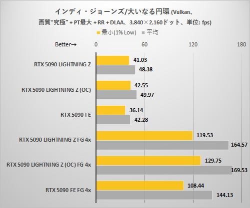 全体の傾向はほかのゲームと同じ。パストレーシングによる描画処理が格段に重いゲームだけあって、3,840×2,160ドットでフレーム生成がない状態ではDLSSを利用して内部解像度を下げないと平均60fpsを超えるのは難しい。だがDLSS MFGさえ使えば3,840×2,160ドット+DLAAという超重量設定でも高フレームレートが出せるのはさすがRTX 5090といったところ。特に最後のグラフではRTX 5090 LIGHTNING ZのEXTREMEモード+OC設定を利用することで最低フレームレートも大幅に伸びている点に注目したい。