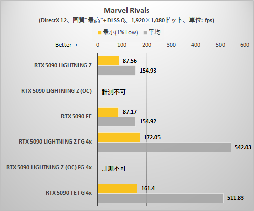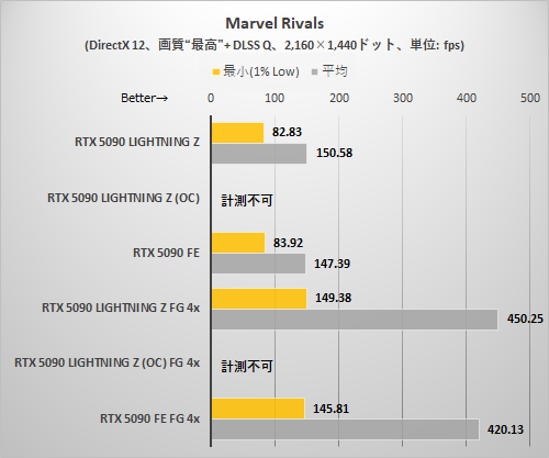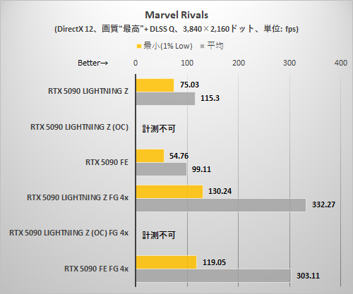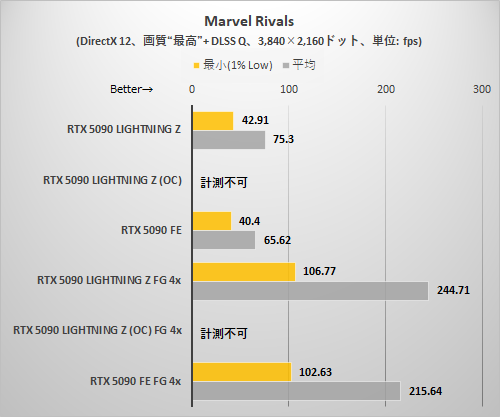Marvel Rivalsでは画質「最高」に設定。ゲーム内蔵ベンチマーク再生中のフレームレートを計測した。このゲームのみ、RTX 5090 LIGHTNING ZのEXTREMEモード+OC設定ではベンチマークが完走しなかったため、値なしとしている。