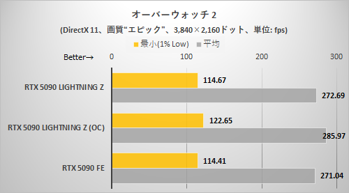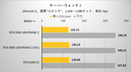 オーバーウォッチについてはもっとも差が付いていない。特に1,920×1,080ドット時のフレームレートは350fpsの見えない壁に阻まれているが、これはCPUが律速になっていると思われる(一応言及しておくと、ゲーム内のフレームレート上限は600fpsである)。Ryzen 9 9950X3Dのように3D V-Cacheを搭載したRyzenなら、よりCPUが律速になりにくいため、もう少し差が付くと推察される。もっとも、Core Ultra 9 285Kでも解像度を引き上げるにつれGPU側が律速するようになりフレームレートに差が出てくる。とはいえEXTREMEモード+OC設定でようやくRTX 5090 FEに差が付く程度なのだから、OverwatchにおけるRTX 5090 LIGHTNING Zはかなりのオーバースペックであることは確実だろう。