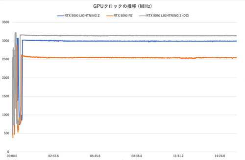 次はGPUクロック。RTX 5090 FEのクロックは2.6GHz弱の辺りで安定する一方、RTX 5090 LIGHTNING Zは3GHz近辺で安定。さらにEXTREMEモード+OC設定では3,140〜3,150MHz、前述の設定値どおりにクロックが伸びており、さらにそれが安定している点に注目したい。前掲の温度推移ではOC設定時でもGPU温度は60〜65℃であることを考えると、RTX 5090 LIGHTNING Zのオーバークロックのしやすさが分かるというものだ。