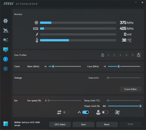 RTX 5090 LIGHTNING Zには2種類のvBIOSが搭載されている。標準のOCモードはTGP 800W設定だが、EXTREMEモードではTGPは1,000Wにまで引き上げられる。ただEXTREMEモードを選択してもGPUやメモリのクロックはOCモードと同じであるため、手動でオーバークロックをしない限りEXTREMEモードで性能向上はほぼ期待できない。「3DMark」などで軽く試した限りは、OCとEXTREMEモードの間には誤差程度の差しか出なかった。RTX 5090 LIGHTNING Zの性能を限界まで引き出したいなら、クロックと電圧の調整に全精力を傾けたいところだ。