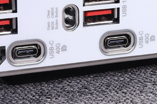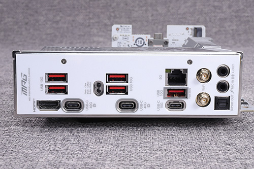 バックパネルインターフェイスには、X870チップセットの必須要素である40Gbps対応のUSB4ポート2基のほか、5GbE対応の有線LANポートやWi-Fi 7といった先進的なインターフェイスを搭載している。