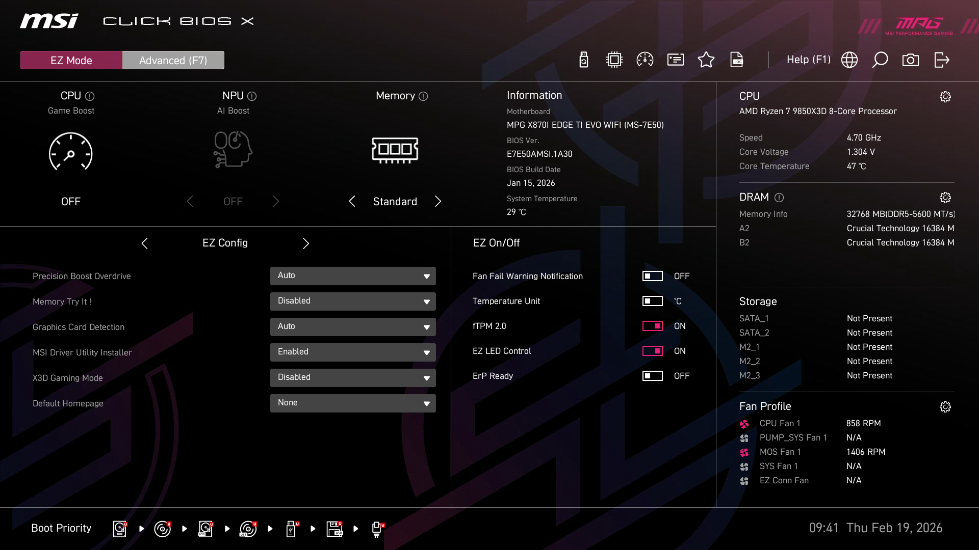 MPG X870I EDGE TI EVO WIFIは、BIOSメニューにMPGシリーズ用にカスタマイズされた「MSI Click BIOS X」を採用。グラフィカルなインターフェイスでBIOSを設定できる。