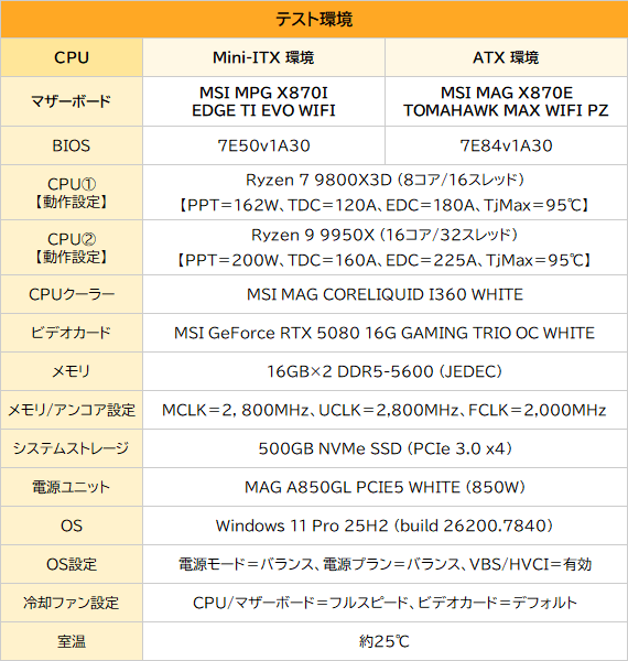 高性能CPUから本来のパフォーマンスを引き出せるのか確かめるべく、今回はゲーミングCPUの「Ryzen 7 9850X3D」と、16コア/32スレッドのハイエンドCPU「Ryzen 9 9950X」を用意。