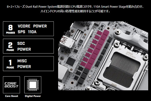 CPUに電力を供給するVRMには、8+2+1フェーズのDuet Rail Power System(DRPS)電源回路を搭載。CPU向けの8フェーズに110A対応Smart Power Stage(SPS)を採用し、VRM冷却用の小口径ファンと組み合わせることで、大電力を消費するSocket AM5のハイエンドCPUにも対応している。