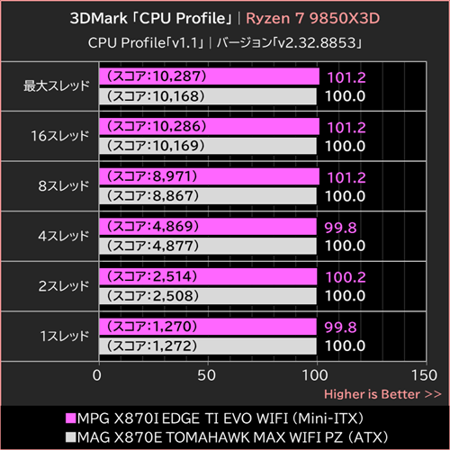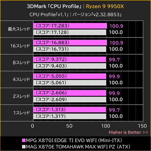 MPG X870I EDGE TI EVO WIFIは、Ryzen 7 9850X3DとRyzen 9 9950Xの両方で、ATXマザーボードであるMAG X870E TOMAHAWK MAX WIFI PZと同等と言えるスコアを記録した。