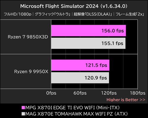 MPG X870I EDGE TI EVO WIFIが記録した平均フレームレートは、Ryzen 7 9850X3Dが「156.0fps」で、Ryzen 9 9950Xが「121.5fps」。これはMAG X870E TOMAHAWK MAX WIFI PZが記録した「155.1fps」および「120.9fps」と同等のパフォーマンスだ。