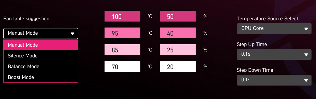 テスト時点のBIOSバージョン「7E50v1A30」では、VRM冷却ファンのデフォルト設定が「Manual Mode」になっており、ファン回転数は最大で50%以下の低回転寄りになっているほか、ファン制御の基準となる値がCPU温度の「CPU Core」を参照して動作する設定になっていた。