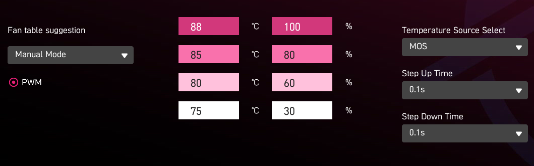 どの部分の温度を監視して冷却機構の動作の強弱を決めるか、というのは、CPUクーラーなどでも検討が必要なポイントになることもある。今回のVRM冷却の場合は、よりストレートとに、VRM温度自体をトリガーにするのがベターだろう。そこで、ファンがどの値を基準に動作するのかを決める「Temperature Source Select」の項目をVRM温度である「MOS」に変更し、VRMが75℃の状態でファン回転数30%、そこから段階的に上げていき、VRM温度が88℃でファン回転数が100%になるように設定した。