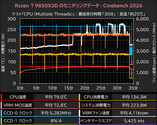 まずはRyzen 7 9850X3Dを使用した際の結果だが、Cinebench 2026実行中は平均134.3Wの電力を消費しながら、平均5,282MHzで動作していた。CPU温度は平均79.0℃(最大81.6℃)で、CPUは温度リミット(TjMax)の95℃を下回っており、推移グラフからも何らかのスロットリングが発生した様子はみられない。