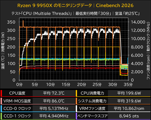 Ryzen 9 9950Xを動作させた際は、CPU消費電力がAMDが定格動作とする電力リミットの200Wに達したのち、リミットの上限200Wを維持したまま推移。CPUクロックはCCD-0が平均5,137MHz、CCD-1が平均4,940MHzで、CPU温度は平均72.3℃(最大73.2℃)だった。