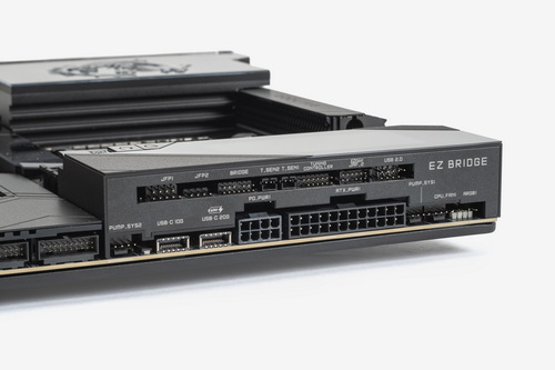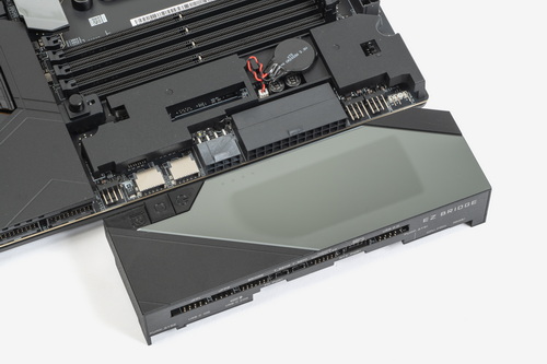 ロマンあふれるギミックの多さも本機の魅力だ。まず、写真を見ても分かるとおり、マザーボードの表面にほとんどコネクターがなく、パッと見えるのはCPUの補助電源(8ピン×2)だけ。ほとんどのコネクターはマザーボードの側面に集約されており、いわゆるピンヘッダー類のほとんどは着脱可能なドック「EZ Bridge」に搭載されている。ケーブルマネジメントの工夫はある程度必要だが、表面からケーブルを極力目立たなくすることも可能だ。