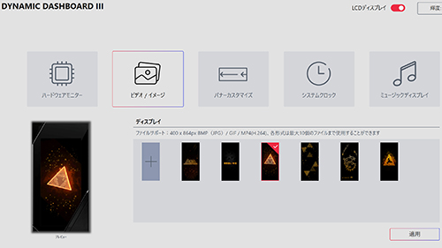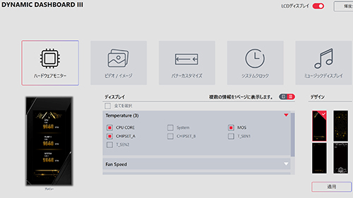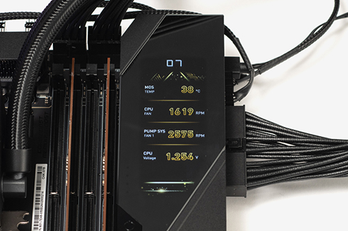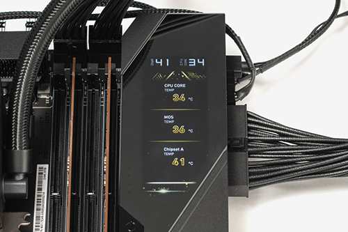 美しくケーブル処理を仕上げられる工夫に加えて、ビジュアル面のギミックについても抜かりがない。電源回路、CPUに一番近いM.2スロット、チップセット付近それぞれのヒートシンクには制御可能なLEDを内蔵。さらにEZ Bridgeの上部には3.99型モニター「Dynamic Dashboard III」を搭載。CPUやチップセットの温度、ファンの回転数などハードウェア情報をはじめ、好きな画像や動画、時計、再生している音楽の情報などを表示できる。性能に加えて、ドレスアップにも徹底的にこだわりたいというニーズにも応えられるのだ。
