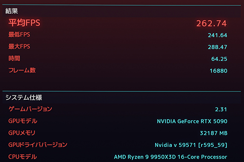 文句なしに高い性能が出ている。Cinebench 2026の結果からRyzen 9 9950X3Dの性能をしっかり引き出せていることを確認でき、3DMarkもアベレージ以上のスコアを出した。サイバーパンク2077も4Kかつ強烈な描画負荷のあるパストレーシング処理が加わるレイトレーシング:オーバードライブ設定でも平均262.74fpsと高いフレームレートが出ており、現役最高クラスの性能を実現できていると言ってよいだろう。