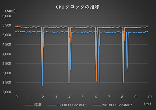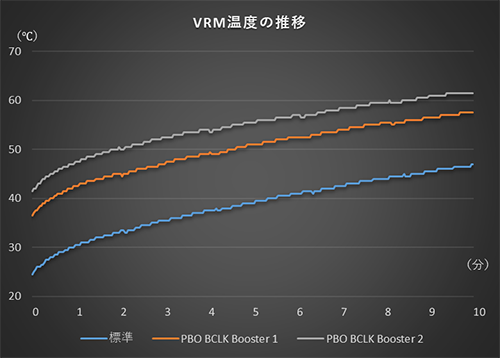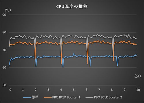 標準(UEFIデフォルト設定)では、ブーストクロックは5.15GHz前後で推移、PBO BCLK Booster 1は5.35GHz前後、PBO BCLK Booster 2は5.36GHz前後での推移となった。これによってCPU性能を向上させているわけだが、200MHzほどのCPUクロック上昇でVRM温度は大きく変わる。標準では9950X3Dでフルに動作させて平均38.5℃と十分過ぎる低い温度になっているが、PBO BCLK Booster 1で平均50℃、PBO BCLK Booster 2で平均54.7℃までアップ。CPU温度は標準では平均66℃、PBO BCLK Booster 1では平均73.8℃、PBO BCLK Booster 2では平均77.2℃となった。