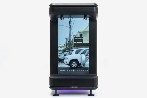 - お立ち台はオープン構造で、背面にミラーの代わりに15.6型の液晶パネルを搭載する。お立ち台に置いたアイテムと液晶に表示した映像を組み合わせた、より高度な展示を可能とする、もっとも芸術性が高い凝った仕様のモデル。置けるアイテムの最大サイズは幅290×奥行き110×高さ328mm