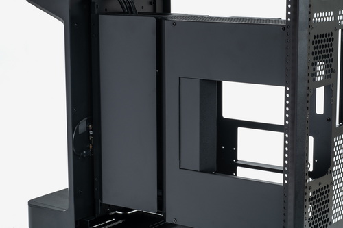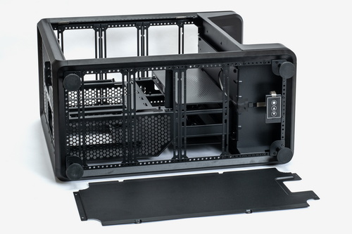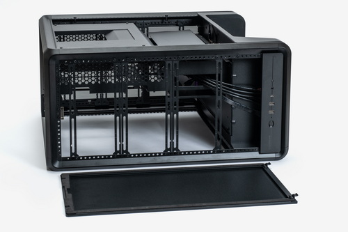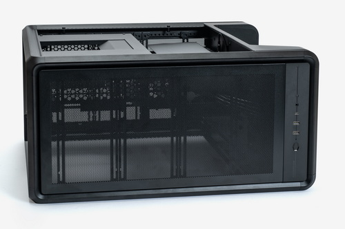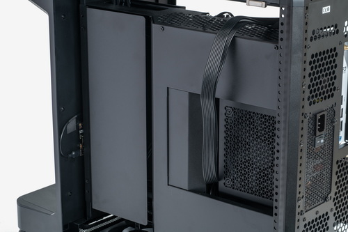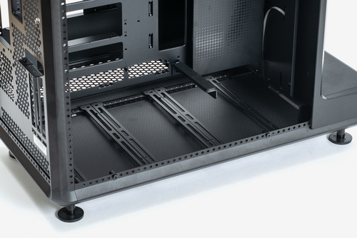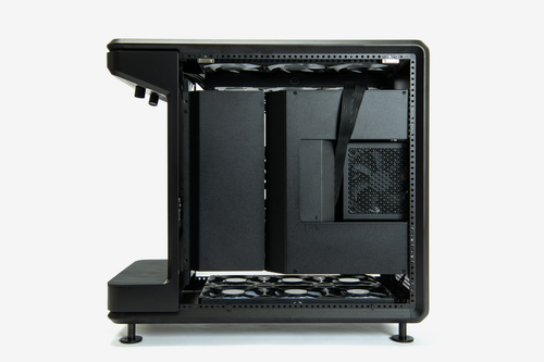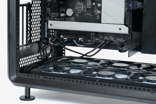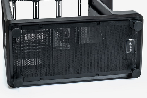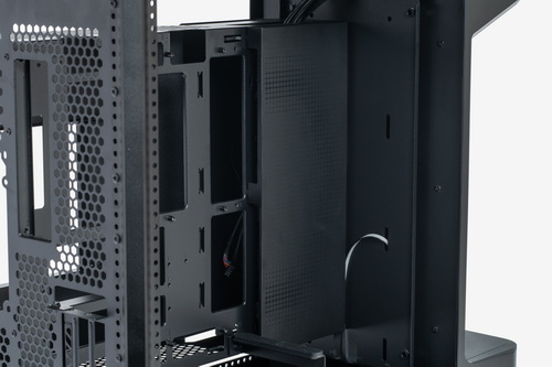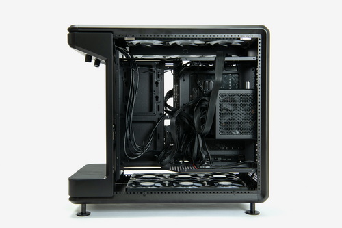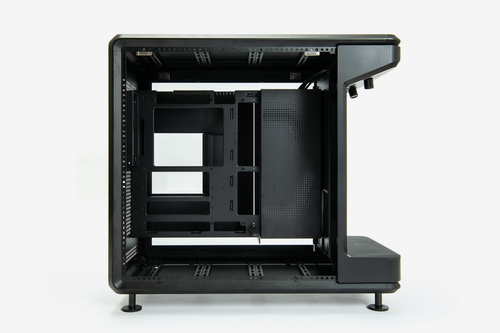 外装パネルはすべてツールレスで取り外し可能で、各部のマウンターやベイ類などはすべて着脱できる。お立ち台というほかにない構造物を装備しつつも、ケース内部の空間には遮蔽物はなく非常に広い。また、いわゆる“デュアルチャンバー構造”となっているため、マザーボードや拡張カードの設置スペースと、電源ユニットや裏面配線を逃がすスペースは完全に独立している。ケーブル類をまとめる作業はかなり容易だ。