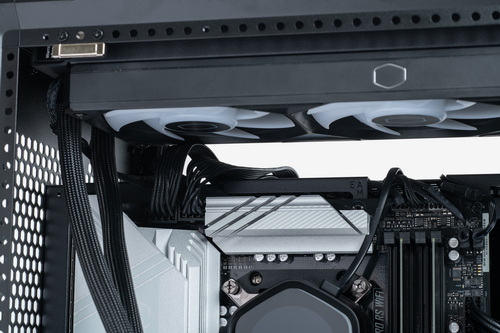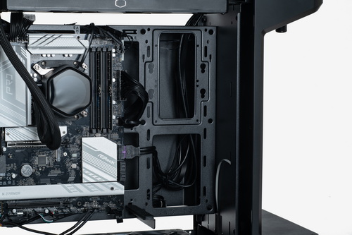 「見せるPC」のセッティングでは、いかにケーブルが悪目立ちしないように処理するかがポイントになってくるが、MasterFrame 360には、ケーブルや2.5/3.5インチドライブを隠すためのカバーが表面、裏面に取り付けられており、面積的にも広いので、正直なところ、ケーブルをあまりきれいにまとめられなくても余裕で隠せる。とはいえ、ここで手を抜き過ぎるとメンテナンス時などに苦労することにはなるので、ある程度キレイに整理しておいたほうがよいとは思う。